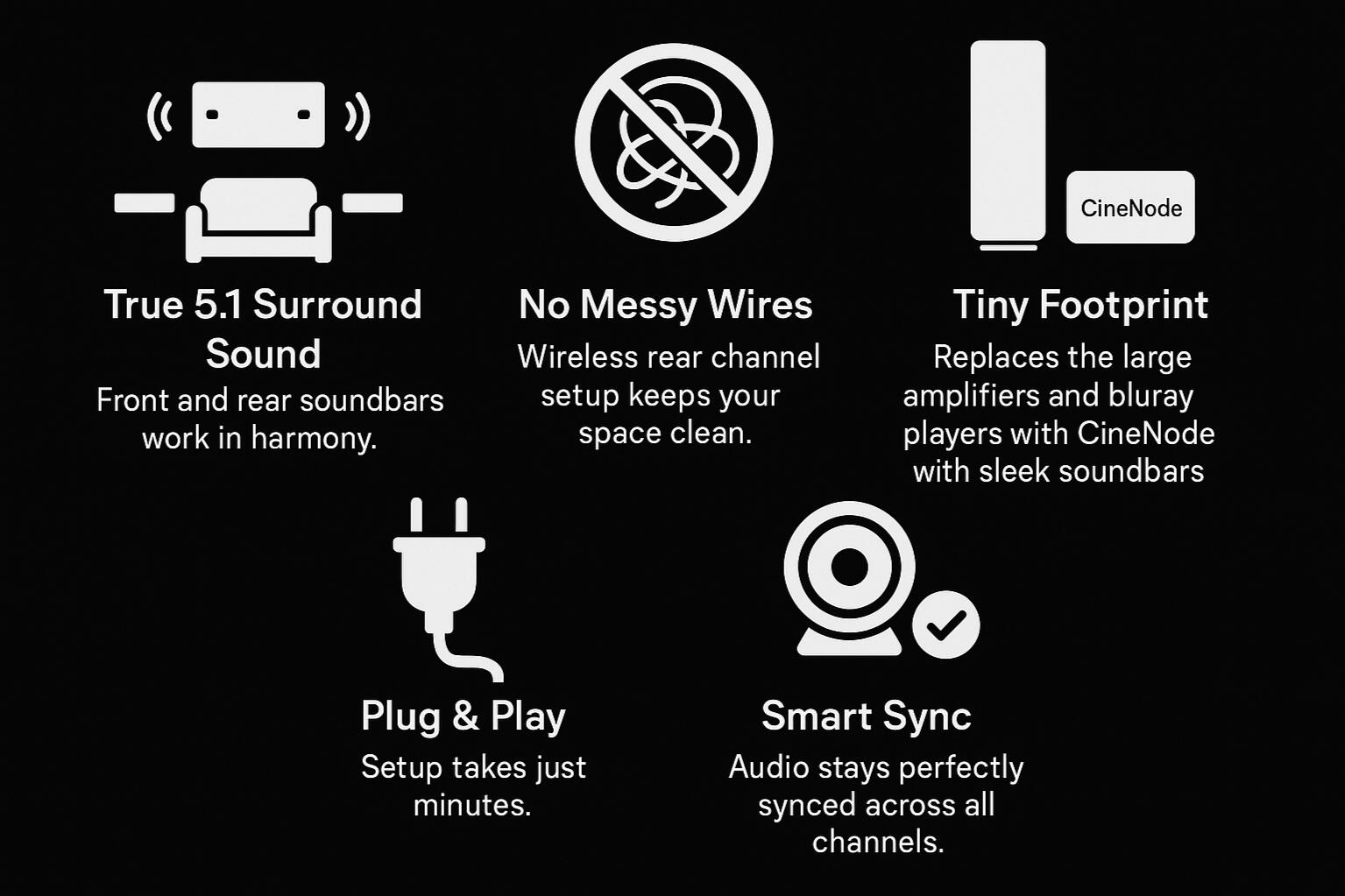 Create your own surround sound eco-system. Our revolutionary compact module plugs into your TV’s optical port and wirelessly connects multiple soundbars—so you get immersive, high-quality 5.1 surround sound without the hassle.